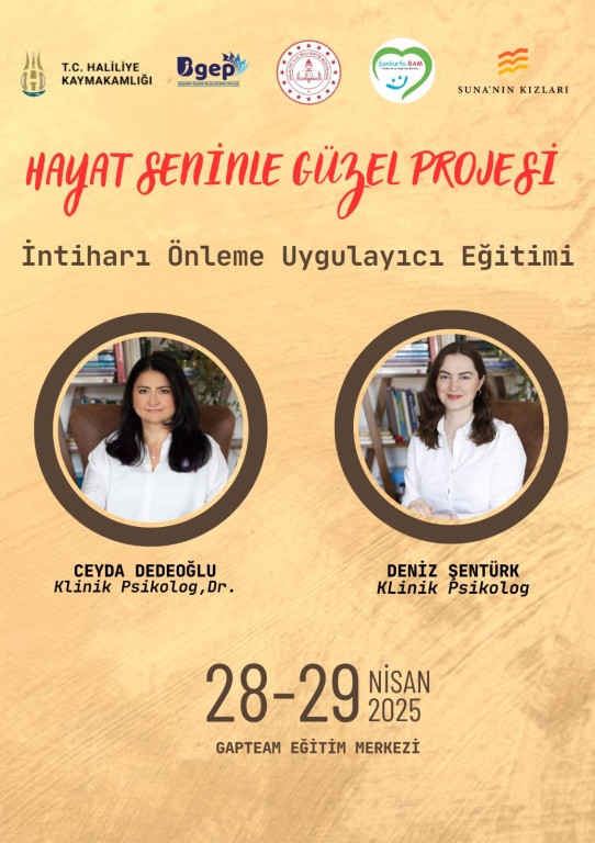 Bigep kapsamında Haliliye ilçe Milli Eğitim Müdürlüğü himayelerinde; Şanlıurfa Rehberlik ve Araştırma Merkezi ile Suna'nın Kızları işbirliği çerçevesinde 'HAYAT SENİNLE GÜZEL' Projesi intiharı önleme uygulayıcı eğitimlerini tamamladık. Programımız İl Milli Eğitim Şube Müdürünüz Mehmet Hasan ARŞİT, Suna'nın Kızları adına Mehmet Veysi ERDEM ve Şanlıurfa Rehberlik ve Araştırma Merkezi Müdürü Bozan DOĞAN'NIN açılış konuşmaları ile başladı. Hayat Seninle Güzel' intiharı Önleme Projemiz; umuyoruz ki hem katılımcı Psikolojik Danışmanlarımız, hem Eğitimcilerimiz hem Şanlıurfa'mız için çok faydalı olur. Katkılarından dolayı Şanlıurfa İl Milli Eğitim Müdürlüğüne, Haliliye Kaymakamlığına, Haliliye İlçe Milli Eğitim Müdürlüğüne, Suna'nın Kızları'na ve Bigepurfa'ya teşekkür ediyoruz.